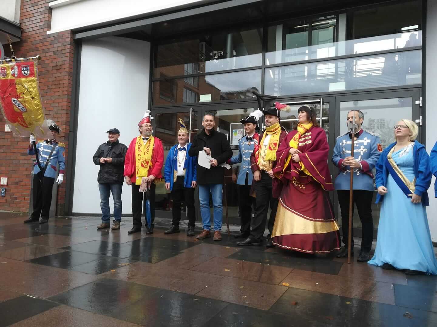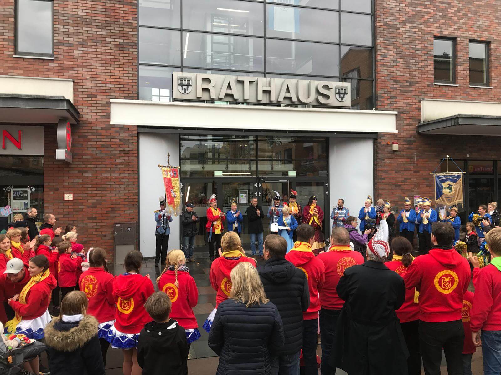 Karnevalsvereine richteten auch noch ein paar Worte an die Anwesenden. Anschließend übergab Michael Grubert traditionell den Schlüssel zum Rathaus und wir stürmten dieses gemeinsam. Natürlich war die Auswahl an gefüllten Pfannkuchen auch wieder sehr groß. Im Rathaus zeichneten sich die Karnevalsvereine mit den aktuellen Orden aus und zum Abschluss führten die Kindertanzgruppe der Bäketaler und unsere Funkengarde ihre Tänze vor.